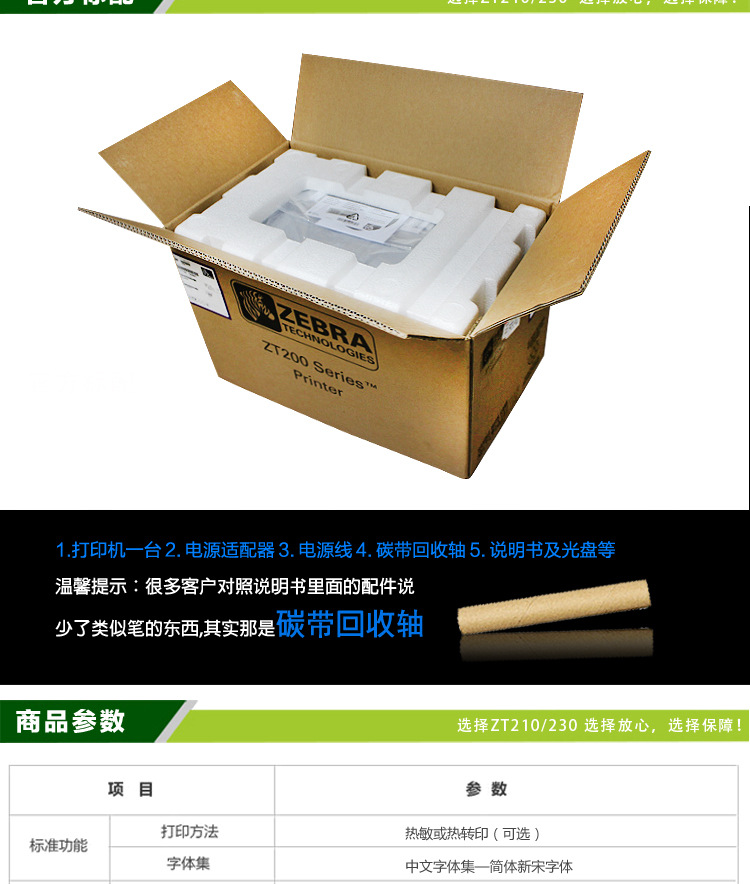 分辨率8 点/毫米/203dpi12 点/毫米/300dpi(可选)内存标配:128MB RAM内存(4MB用户可用) 128MB 闪存(58MB 用户可用)打印宽度104 毫米/4.09 英寸打印速度每秒 152 毫米/6 英寸介质传感器传输式和反射式介质特征最大标签和衬纸宽度:114 毫米/4.5 英寸非连续标签最大长度:991 毫米/39 英寸介质宽度19.4 毫米/0.75 英寸至 11.4 毫米/4.50 英寸打印长度203dpi:3988 毫米/157 英寸300dpi:1854 毫米/73 英寸最大介质卷尺寸外径 203 毫米/8.0 英寸,卷芯内径 76 毫米/3.0 英寸卷芯外径 152 毫米/6.0 英寸,卷芯内径 25 毫米/1.0 英寸介质厚度0.076 毫米/0.003 英寸至 0.25 毫米/0.010 英寸介质类型连续纸、模切纸、标签纸、黑标纸碳带规格( 热转印选项)外径81.3 毫米/3.2 英寸卷芯内径25 毫米/1.0 英寸 (ZT230)标准长度450米/1476 英尺比率介质卷与碳带比率为 3:1宽度40 毫米/1.57 英寸至 110 毫米/4.33 英寸碳带设置碳带墨面向外卷绕,卷芯对卷芯