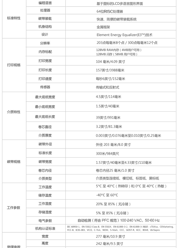 环境参数工作温度:5oC 至 40oC(热转印)和 0oC 至 40oC(热敏)储存温度:-40oC 至 60oC工作湿度:20% 至 85%(无冷凝)存储湿度:5% 至 85%(无冷凝)电气参数通用自动量程电源(符合 PFC 规定),100-240 VAC、47-63Hz符合 Energy Star机构认证标准IEC 60950-1、EN 55022 Class B、EN 55024、 EN 61000-3-2、EN 61000-3-3标识:cTUVus、CE Marketing、FCC-B、ICES-003、VCCI、C-Tick、NOM、S-Mark、CCC、GOST-R、KCC、BSMI、UkrSepro物理参数(闭合状态)宽度:242 毫米/9.5 英寸高度:277 毫米/10.9 英寸深度:432 毫米/17 英寸重量:9.1 千克/20 磅选件和附件剥离 — 向前衬纸,可被动剥离,无需卷取轴剥离 — 向前衬纸,可被动剥离£¬带衬纸卷取轴(仅出厂设置)切纸器 — 向前闸刀式切纸器实时时钟 (RTC)键盘显示单元 (KDU)